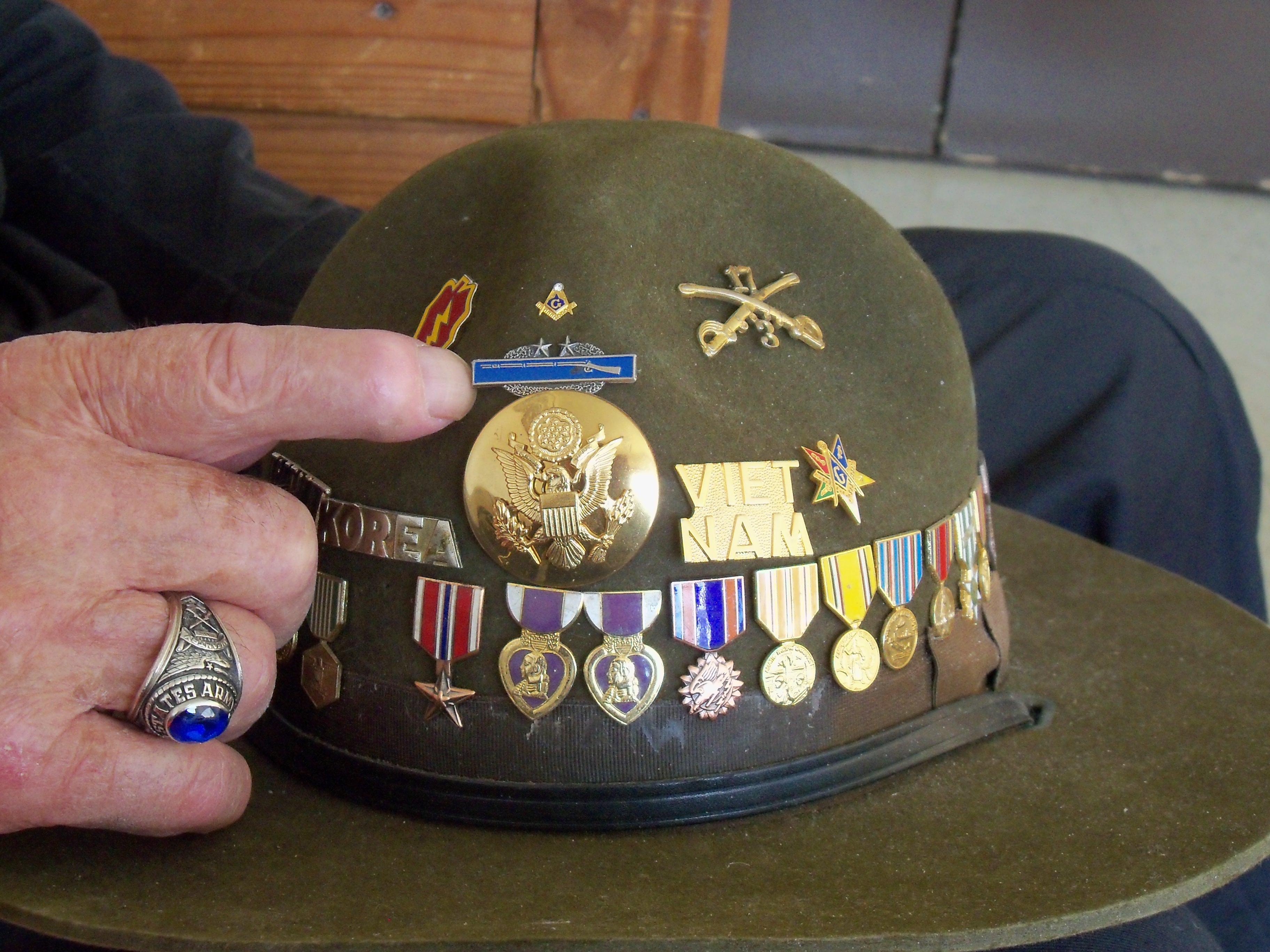 Grenier still proudly wears his traditional olive drab green hat with a wide brim, worn at one point during his career when he was a DI, or drill instructor. The hat is studded with pins and miniature commemorative medals. “No, I never made anyone cry as a drill sergeant. What you see on TV or movies, all the yelling and screaming and getting in someone’s face. I didn’t do that. They did what I told them to, though,” he said.