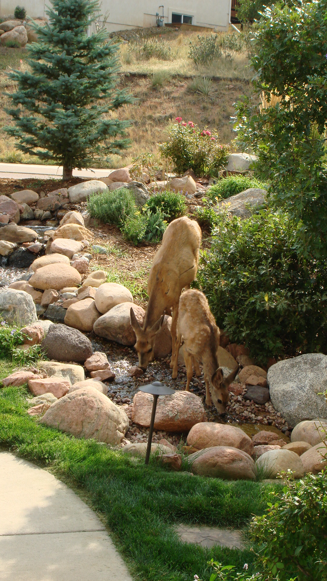 One of my favorite places to write is on my front patio in the morning. I take my laptop, coffee, maybe a research tome or two, and settle in beside our landscaped creek. The sound of water, the scent of dewy grass, sunrise creeping on the mountain slopes just beyond the scrub oak act on my spirit like pure grace. Lord, what beauty! What joy You took in creation. How blessed and humbled I am to continue the story You began. As I open my documents to my work-in-progress, read back and settle into my tale, I’m aware of tiny bright yellow birds with black wings darting down from the oak branches to flutter playfully in the water. A hummingbird hovers a few feet away, checking me out before dipping into the throats of hanging basket flowers.  I put my head back down, shaping and moving a suspenseful scene when motion catches my eye. Oh joy! Visitors!