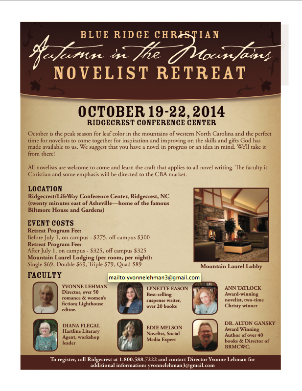 For additional information: http://ridgecrestconferencecenter.org/event/novelist or google Blue Ridge Novelist Retreat – You may contact Yvonne at: yvonnelehman3@gmail.com