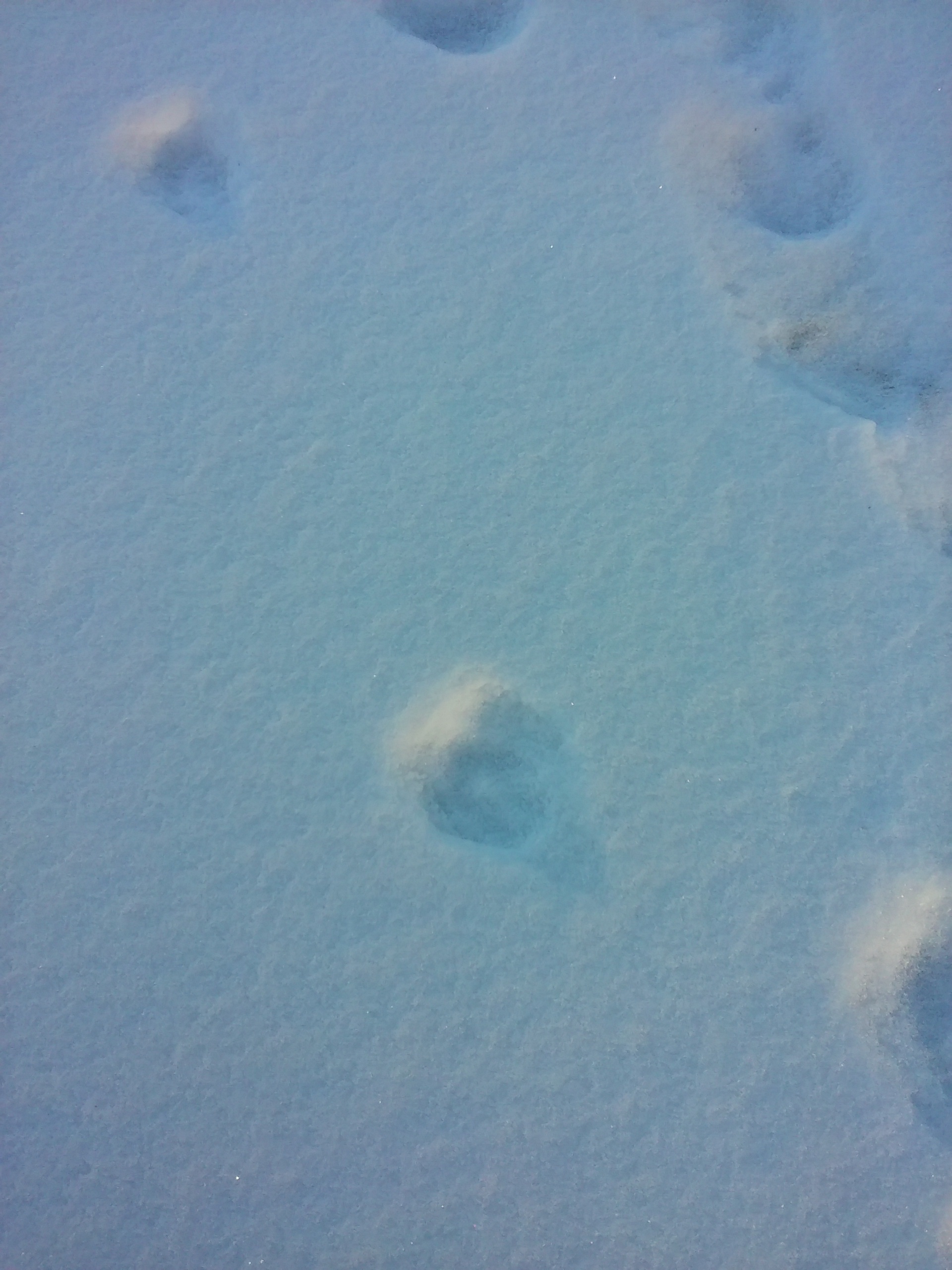 Picking up where I left off two weeks ago, I’m still following tracks outside in the snow. But the snow has melted quite a bit since last week’s storm. What was once so light and powdery that I had no trouble shoveling has now been pressed down to a wetter level by the sun’s rays. The tracks we left last week have widened so much that our tracks look as if giants walked around outside the house. The coyote tracks look like those of much larger dogs, with claw marks that might resemble that of a bear. I’m glad I saw them when they were fresh.