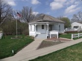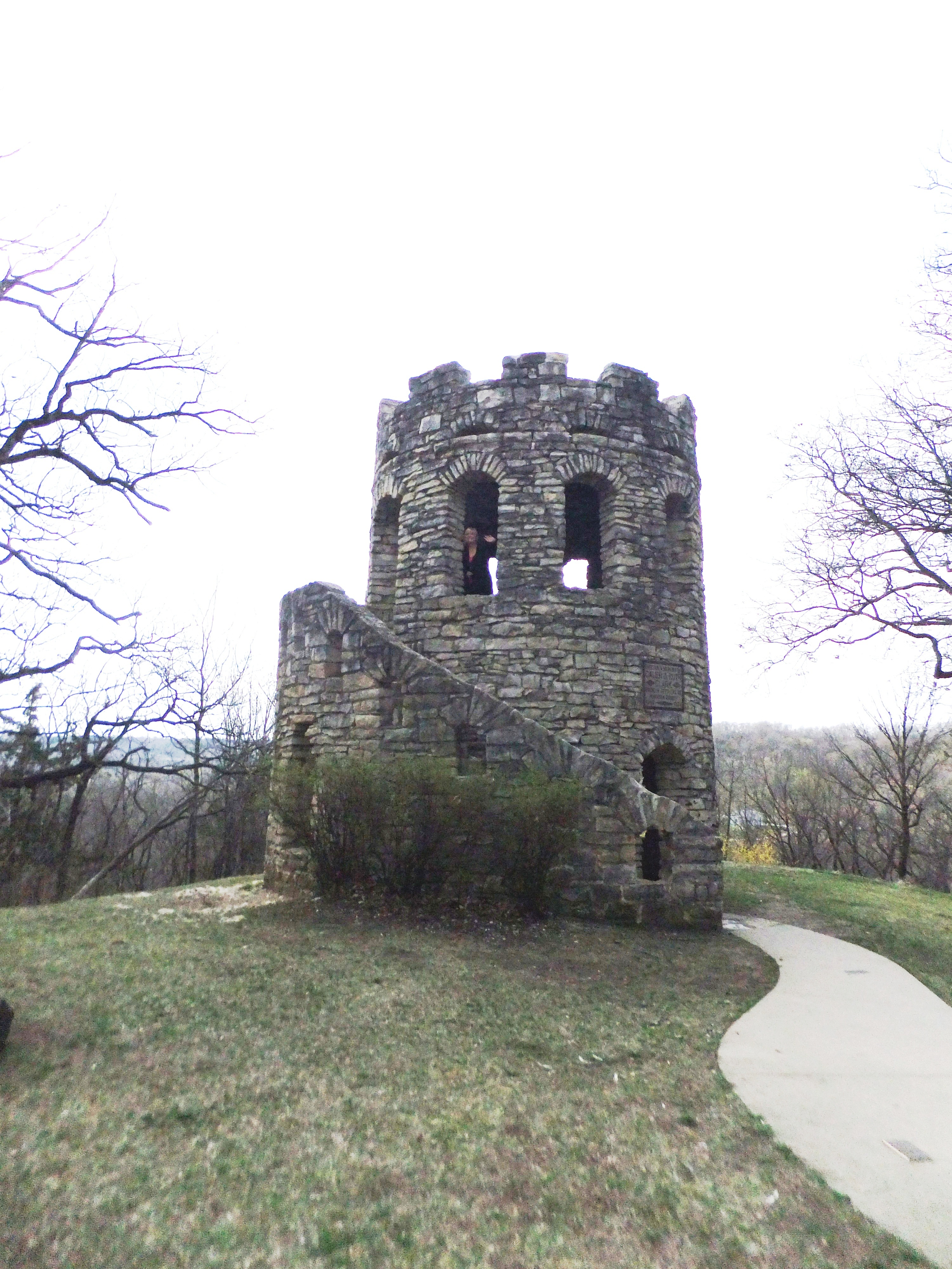 vowed we’d catch it on the way back. (Needless to say, we never found that road again). We finally drove into Winterset where one of the bridges was supposedly located in a park. When we didn’t immediately find it after circling the town several times, we stopped for a photo-op at the John Wayne statue and also took a picture of his home. Once again, we circled the town and then decided to stop and asked directions—the map was no help. Soon we arrived at the park and located the Cutler-Donahoe Bridge which was constructed in 1870 (same as the Imes). While there, we saw a sign pointing up a road to “Clark’s Tower or King’s Castle.” Need I say more? We couldn’t pass up a castle.