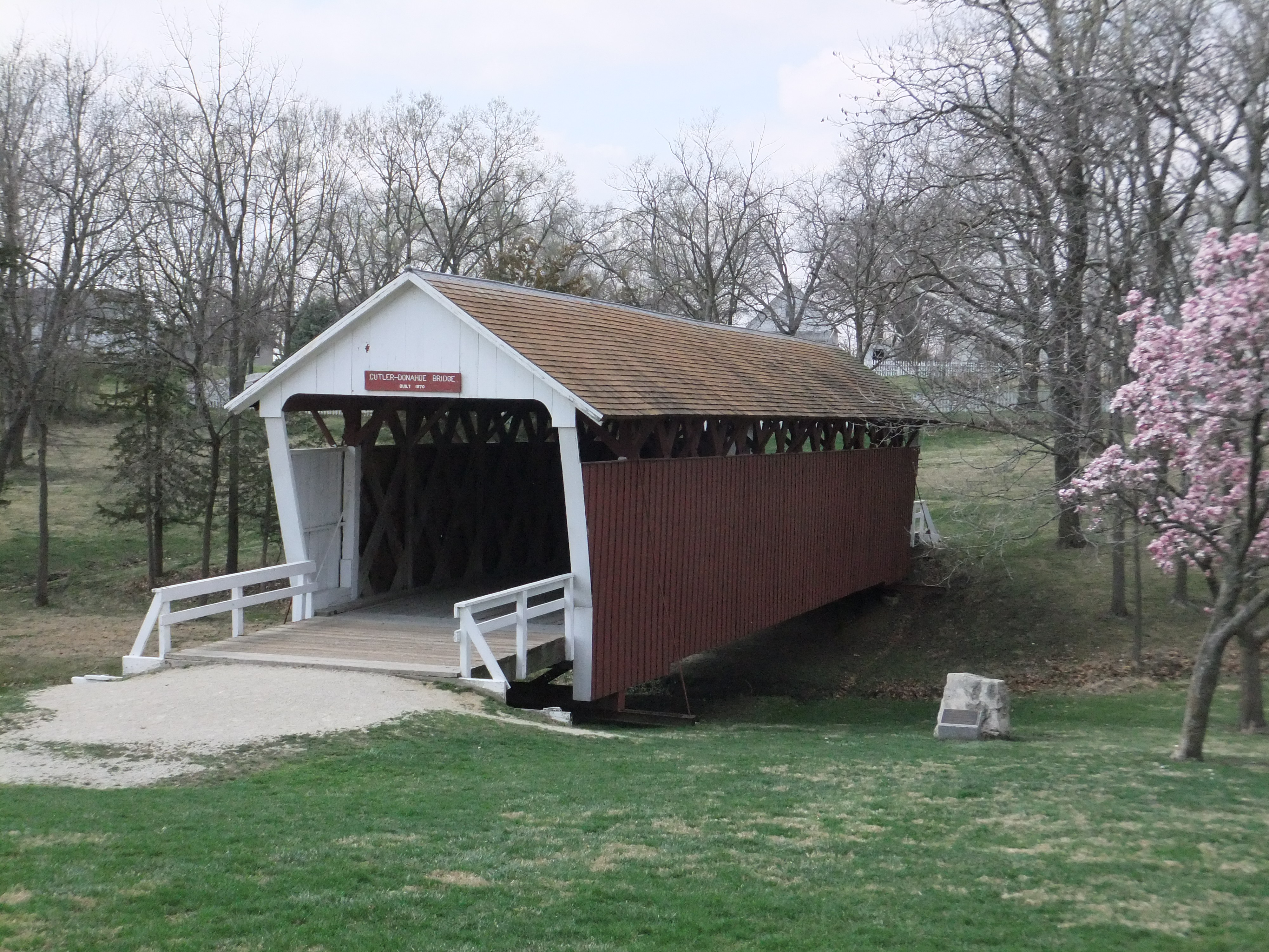 cloudy, the sun popped out often enough that I thought the forecasters were wrong about those terrible thunderstorms they had promised and I didn’t worry too much about racing toward home. When the exit number appeared, we turned off and didn’t have to go far before we caught sight of the first covered bridge. It’s called the Imes Bridge and was constructed in 1870 and it is situated at the outskirts of St. Charles, Iowa.