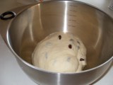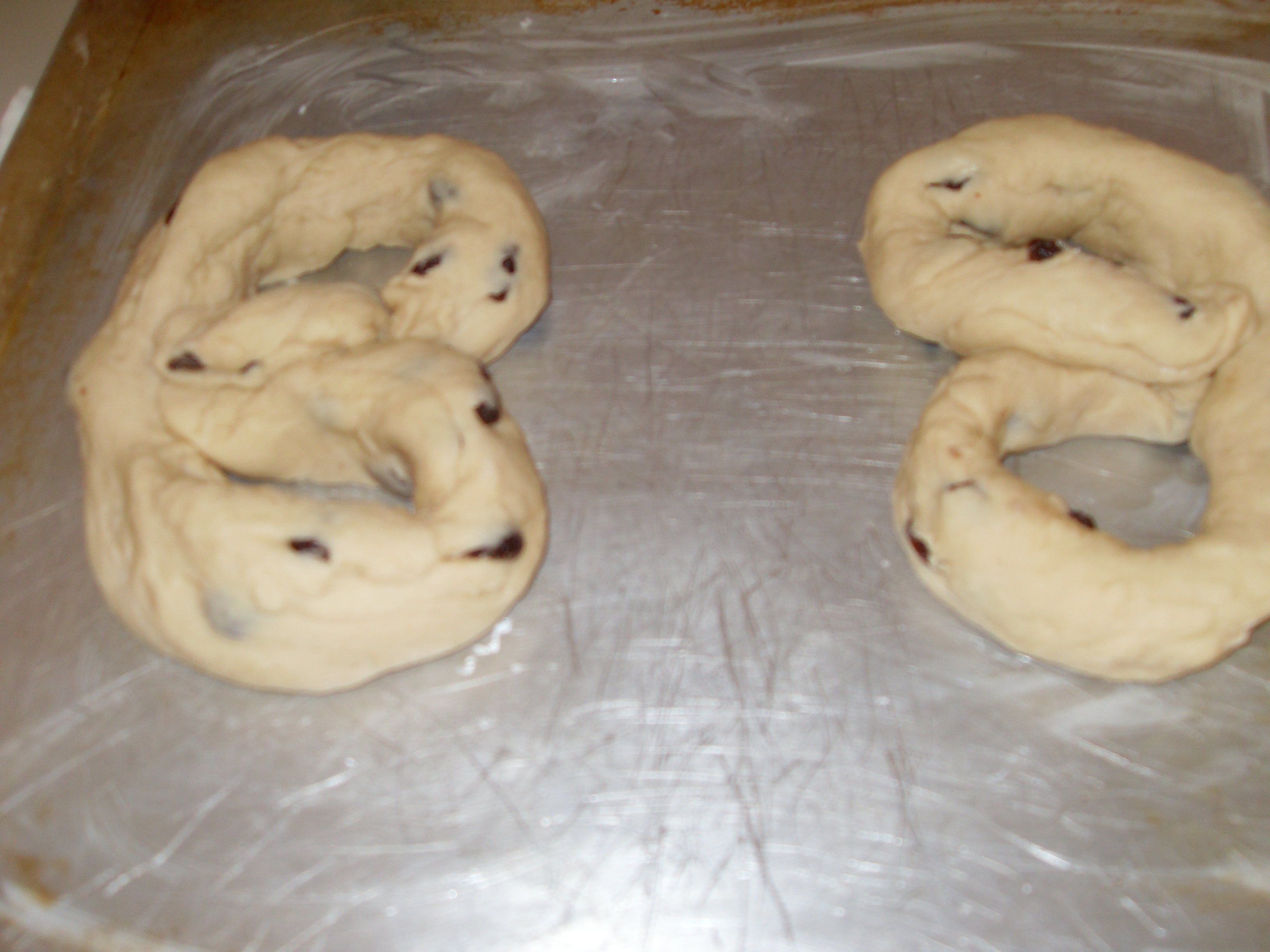 In 1/4 cup very warm water, dissolve yeast. In a very large bowl mix together flour, sugar, salt, raisins, and the rest of the water. Blend in shortening, eggs, and yeast. Turn out on floured board. Knead well for 20 minutes. Place in a very large bowl, cover with a clean cloth, and place in a warm spot overnight. Preheat over to 350 degrees. Roll four equal portions of dough into 2-foot-long ropes (about 1 1/2 inches thick). Fold and twist ropes into pretzel shape, place on a large greased baking sheet, cover with cloth, and allow to rise again–about 3 hours. Dough should double in size. Bake till golden brown (exact time depends upon size of pretzels) about 20 minutes. Allow to cool and rost with thick vanilla frosting and sprinkle tops with coconut or nuts if desired. Makes 4 pretzels.