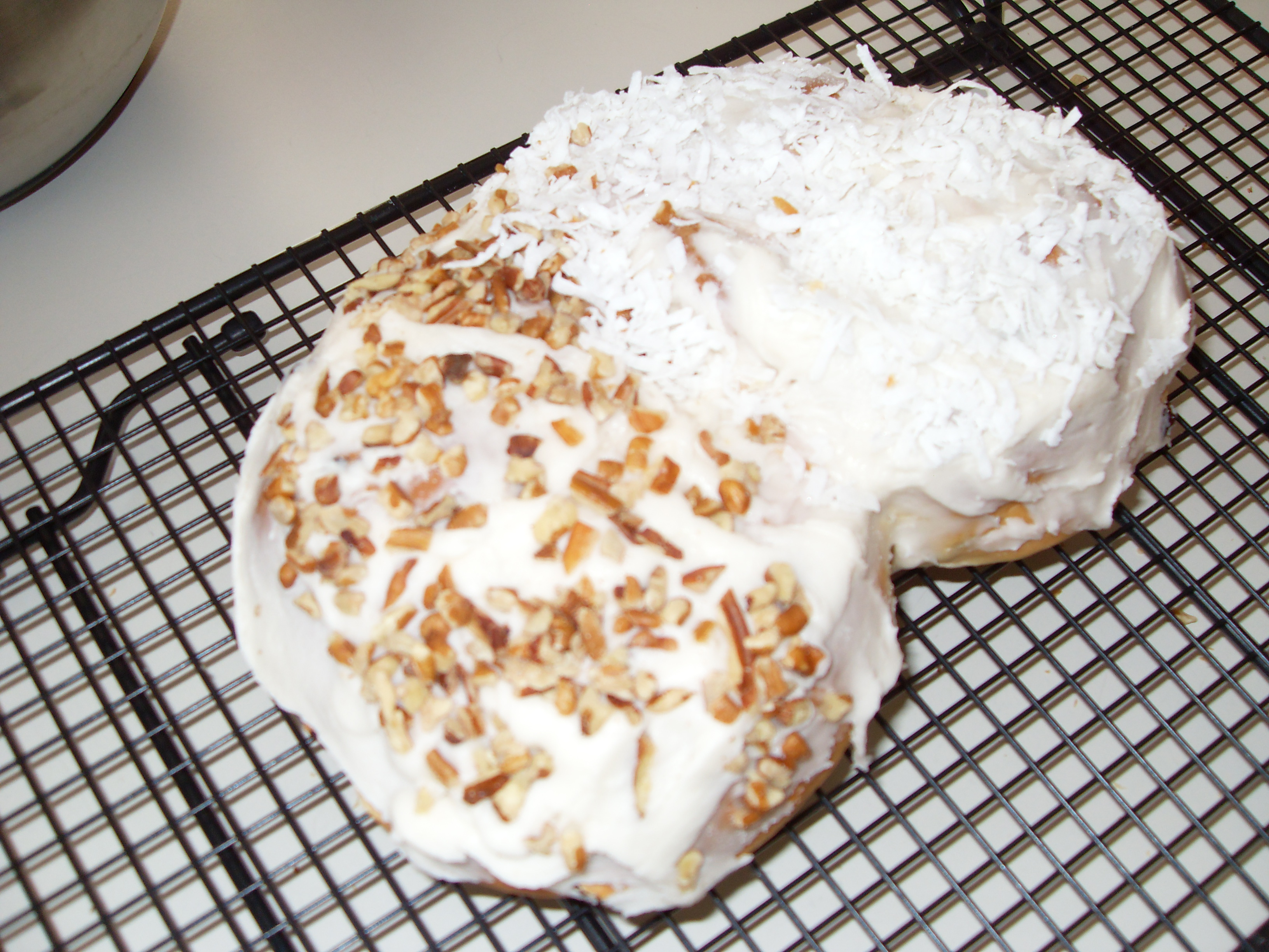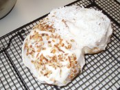 As I mentioned earlier, the pretzel is frosted and sprinkled with coconut or chopped nuts. Among the Amana colonists there remains a bit of disagreement about whether the frosting should be topped with chopped nuts or coconut. Wanting to be fair, I put half of each on the pretzels I baked.