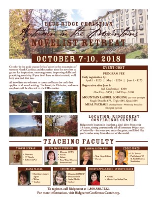 Or… maybe you’d like to try your hand at fiction. Join us at the Blue Ridge “Autumn in the Mountains” Novelist Retreat held at Ridgecrest Conference Center, NC, October 7-10. This is a small group where you get individual attention on whatever idea you may have – or we can even provide ideas!
