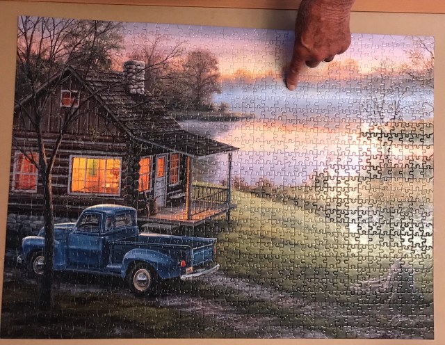Interestingly, one of the puzzles we recently completed has a story to it. We started this puzzle once before a few years ago. We lived in a different home then. We had a folding table with a piece of white cardboard on top of it set up in our living room in front of one of the two sofas. We didn’t have a lot of time to dedicate to it. (You know, real life and all that!) Therefore the puzzle sat there for some time, as we tried to work on it here and there. This puzzle was one thousand pieces, with stunning colors in the sky above, a serene cabin, and an inviting lake.