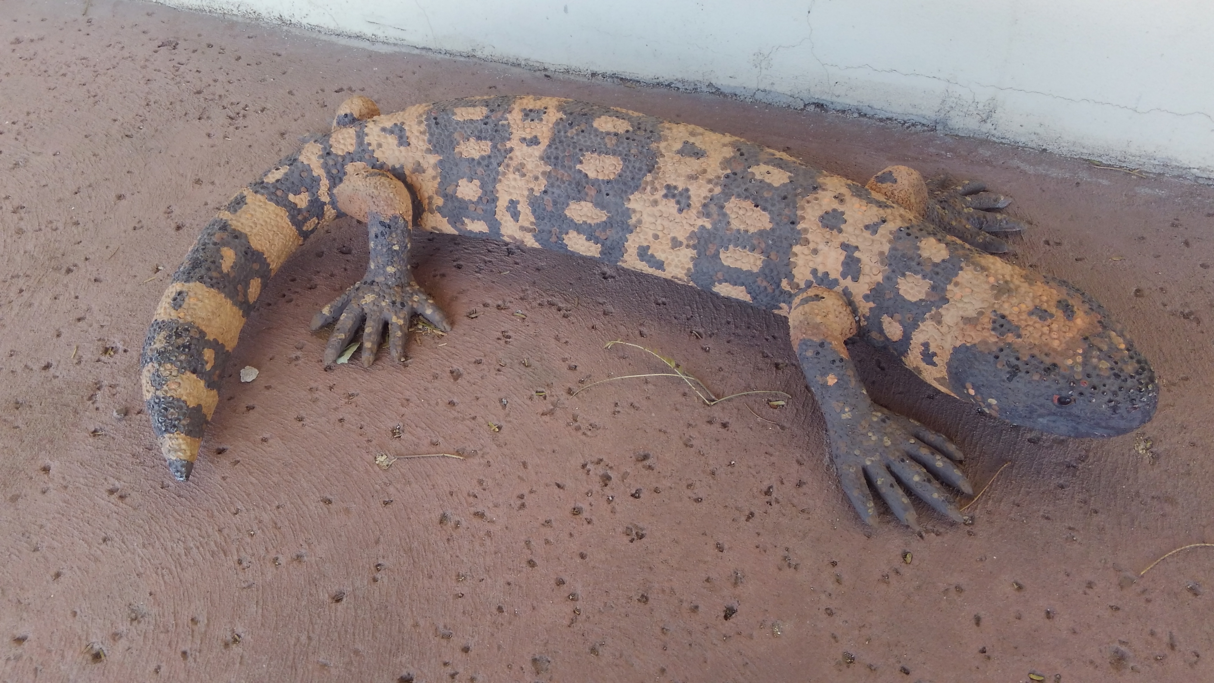 These are metal images of the Western Diamondback Rattler and a Gila Monster. Both are venomous, and therefore not to be messed around with. One needs to watch where one walks when in the Southwestern part of our country. But a certain someone whose name I will not mention was paying more attention to everything but the sidewalk, and when I tried to gently guide him (or maybe her) away from the scary-looking snake, I somehow inadvertently drew attention TO the snake, which looked very realistic.