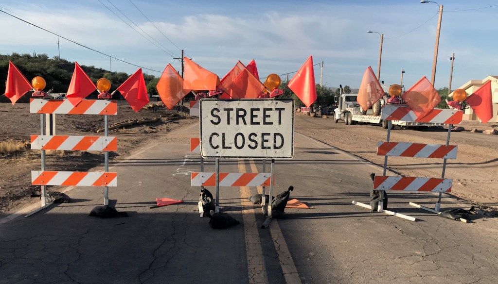 For the past few weeks, the county has been doing roadwork on our little street. They are redirecting a wash in the hope of preventing future flooding. That means the low road is closed to through traffic as they dig up the pavement, put huge pipes in the wash, and do all manner of work.