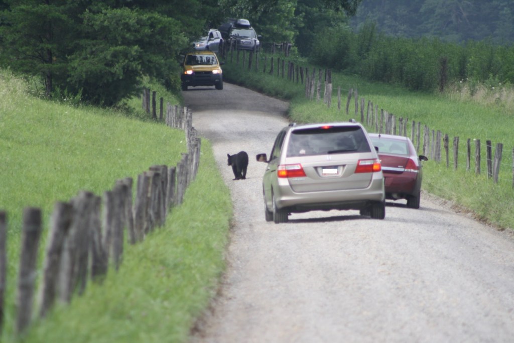 The main road is paved and easy to navigate. But there are a few gravel roads located in Cades Cove that you can drive down as well. A few years back, when we were visiting Cades Cove with one of my sisters, we witnessed another tourist’s car slide off one of the gravel roads. There was a young bear crossing the road at the time. And there was also a lot of traffic, as many were trying to get a glimpse of the bear. In one particular vehicle, the driver got too close to the edge where there happened to be a drop off. The passenger side tires were no longer on the road.