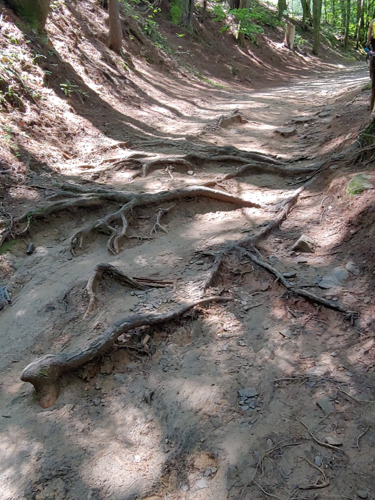 Since our objective was hiking, I planned trips to areas we’ve never been before. On our first day, we did a six mile hike. I’m not an expert, so I would say the trail was moderate. We were thrilled that we walked the trail without giving up. It took forever. (Not really, it just felt like forever, especially when we’d pass people on the way out and they’d say, not much longer, and it was longer!) But eventually we made it to the waterfall at the end of the trail. The scenery, the quietness of the forest, and following a fast moving stream, made it all worthwhile. We even learned to navigate around and over the never ending tree roots and large rocks without any injuries.