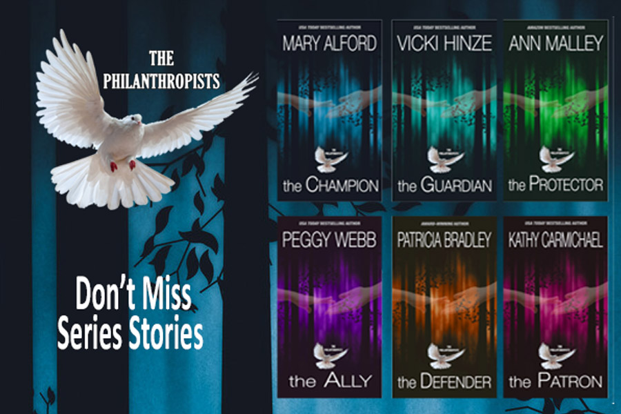 As you know, I love doing multi-author series. I’ve teamed up with Mary Alford, Ann Malley, Peggy Webb, Patricia Bradley and Kathy Carmichael in THE PHILANTHROPISTS!