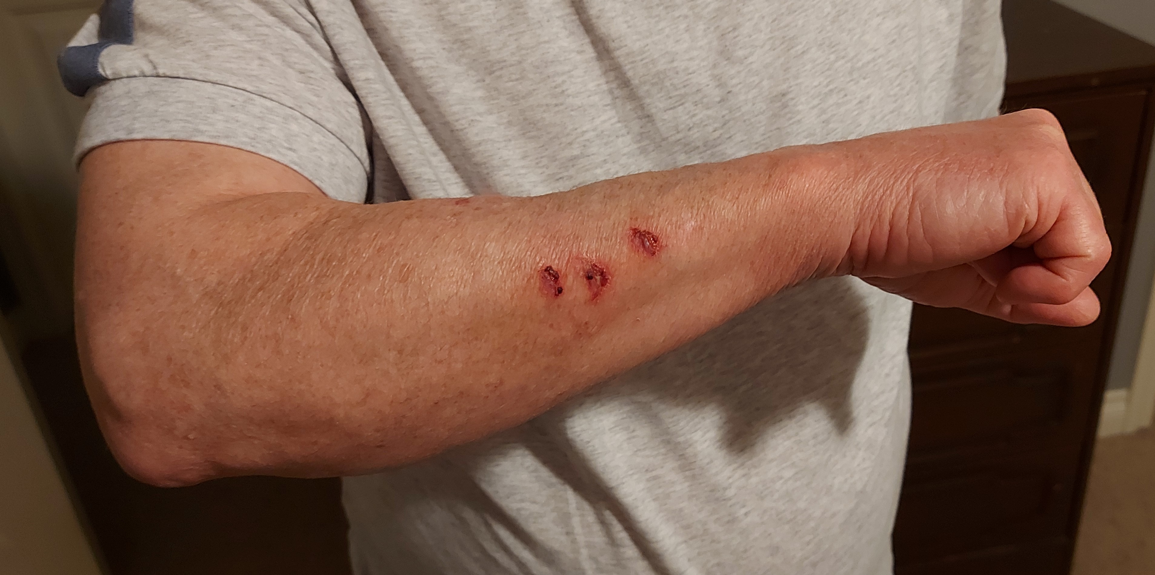 I was upstairs, and my wife called me down to the kitchen to help her with some household task. Probably to use my superhuman strength to twist the lid off a jar. Like a good husband, I rushed to her aid. Unknown to me, our cat followed me down the stairs. Just as I reached the bottom, the cat scooted between my feet and turned to rub against my leg. I stumbled, instinctively threw up my hands, and drove my forearm into the corner of the kitchen doorway. It bounced off as I continued forward and hit two more times before I regained my balance.