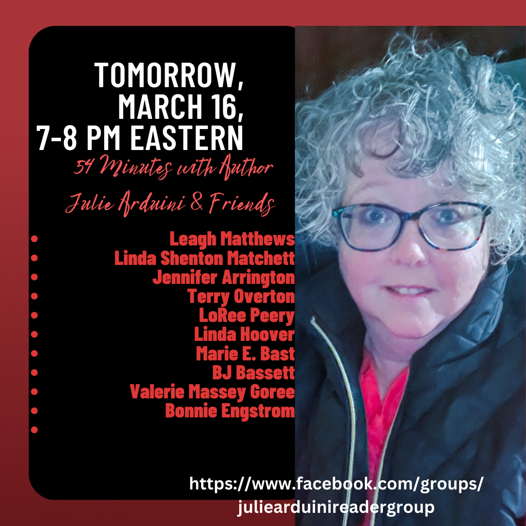 54 Minutes with Julie Arduini and Friends is just that. Tomorrow night from 7-8 Eastern I’m hosting an event on my Reader Group Page featuring ten other authors. Each author, myself included, has five minutes to share whatever they want. They might post once, or as many as three times. But the challenge is they have those five minutes.