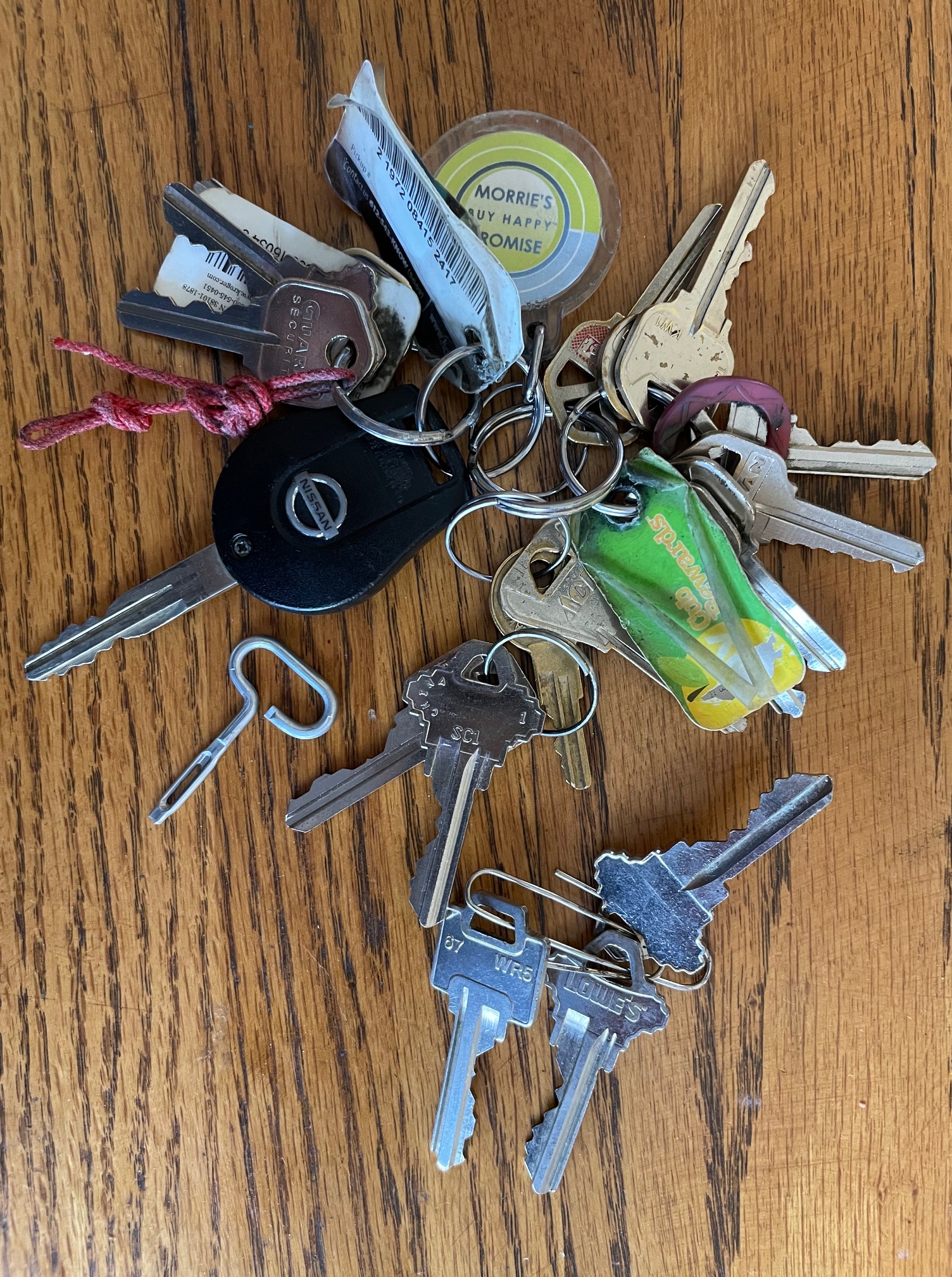 Bundled on a string I wore them around my waist. My keys gave me a sense of power, of owning and locking and unlocking things, and of making machines go.