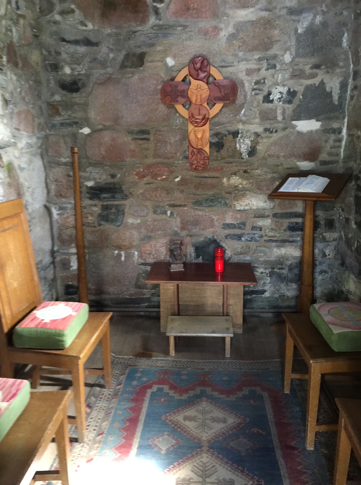 The small cave-like structure attached to the Iona abbey is where St. Columba worked on the manuscript. There’s a large stone on the hill outside where he also sat and worked looking out over the Irish Sea on non-stormy days.