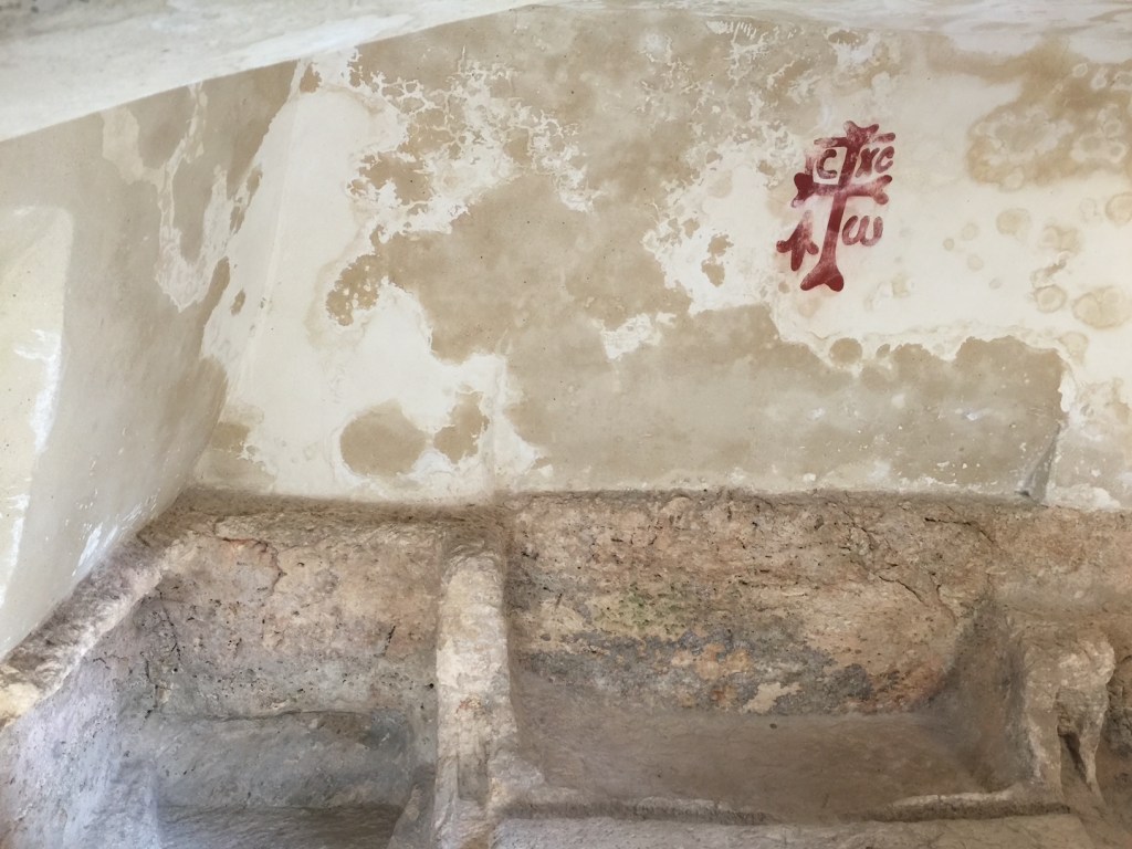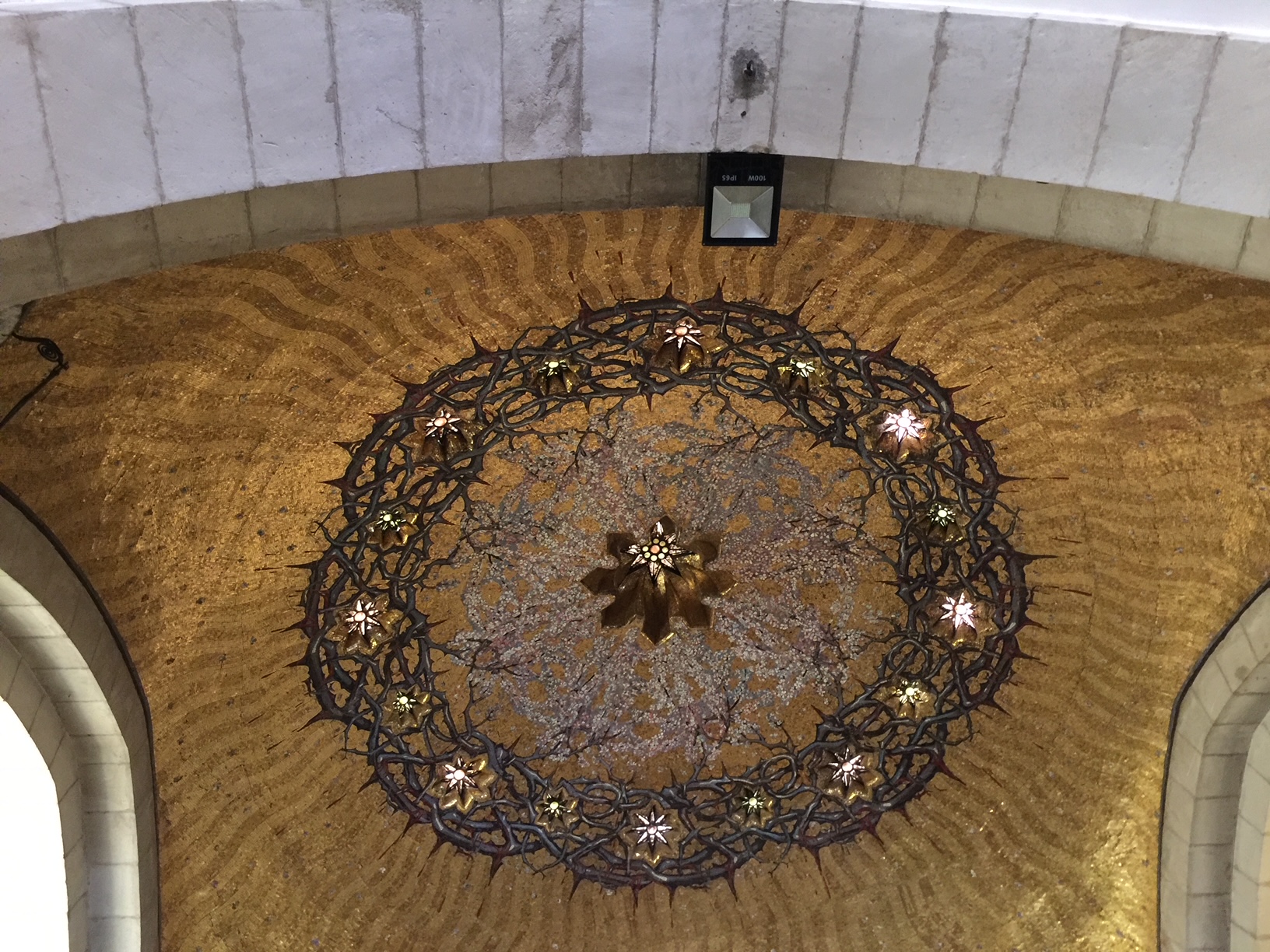 Death can’t stop life. Nothing can stop a living seed from pushing sprouts up or sending anchoring roots down. We’ve all seen sidewalks or driveways where insistent plants pop up through cracks and with sunshine and rain, grow big enough to open those cracks wider until the covering cement may entirely crumble with time. Below is the Crown of Thorns on the Ceiling of the Church of the Flagellation on the Via Dolorosa.
