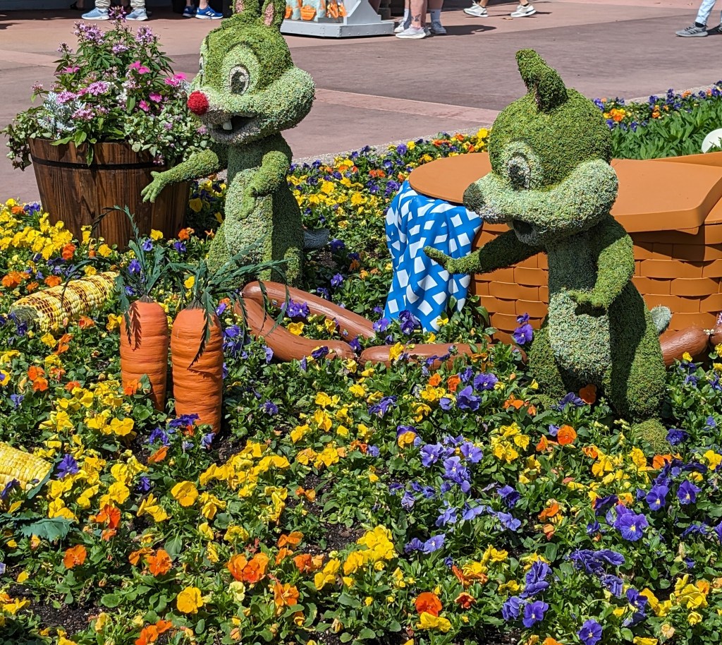 Right now, the Flower and Garden Festival is featured at Epcot. If there is one thing they do well at the park, it is creating beautiful, landscaped gardens and character topiaries. We walk around the park and admire the variety of flowers and plants, as well as the food kiosks along the way.