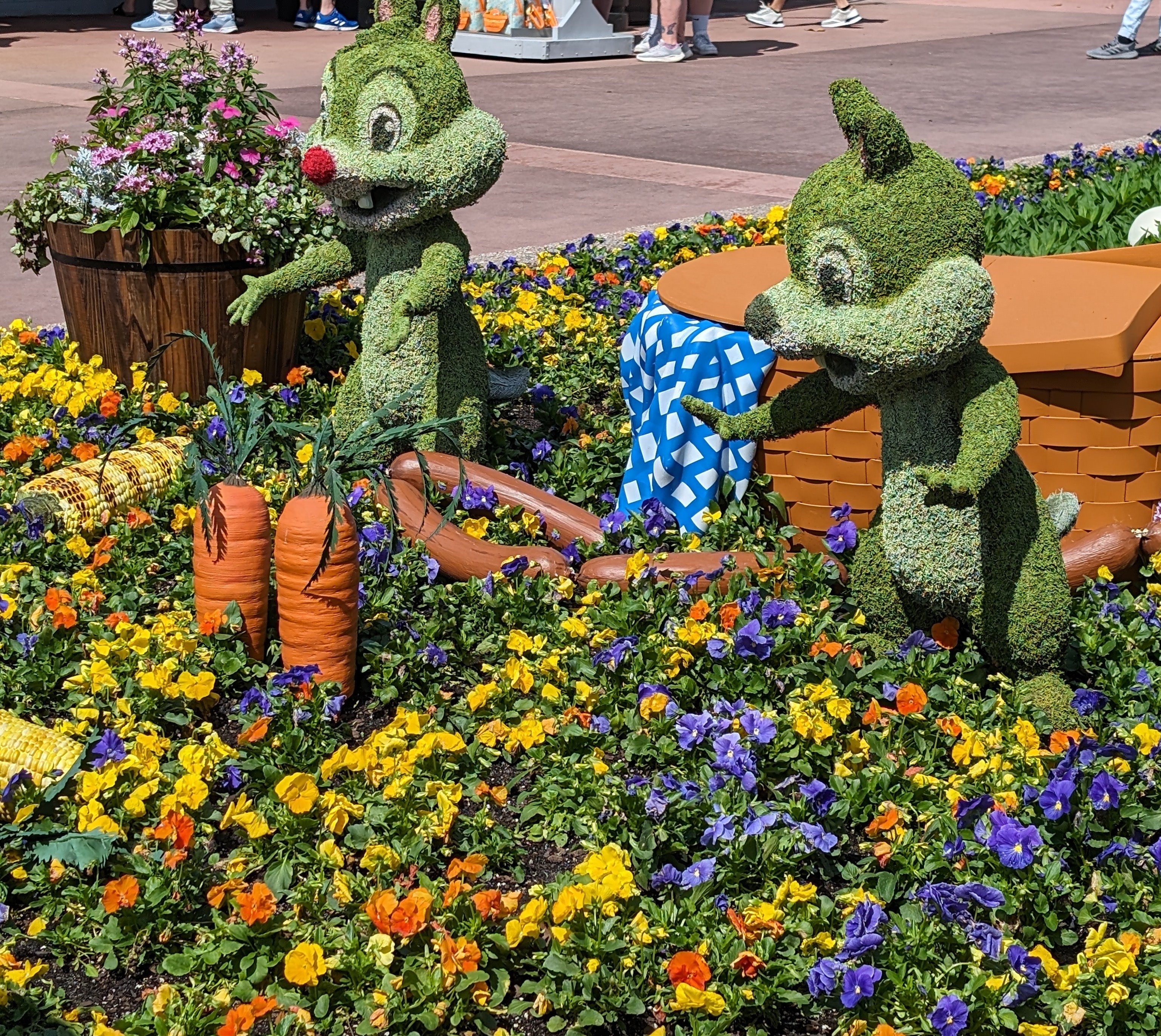 Right now, the Flower and Garden Festival is featured at Epcot. If there is one thing they do well at the park, it is creating beautiful, landscaped gardens and character topiaries. We walk around the park and admire the variety of flowers and plants, as well as the food kiosks along the way.